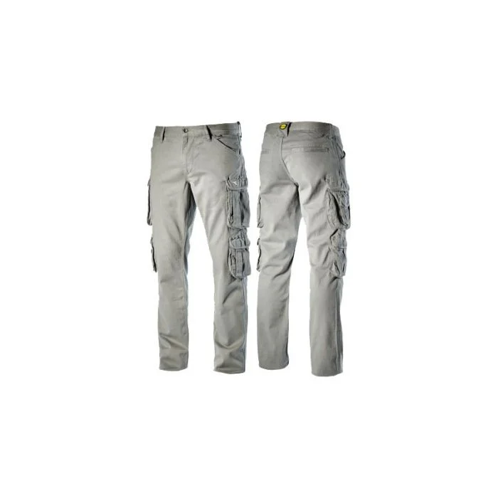Pantalone cargo tasconato elasticizzato, lavaggio ad enzimi, 4 tasche laterali portaoggetti, tripla cucitura.
