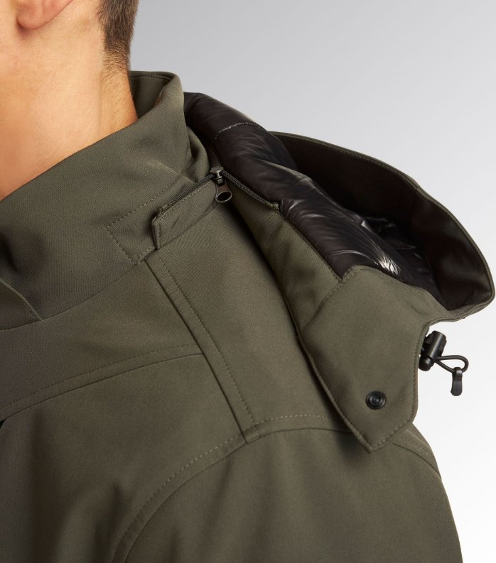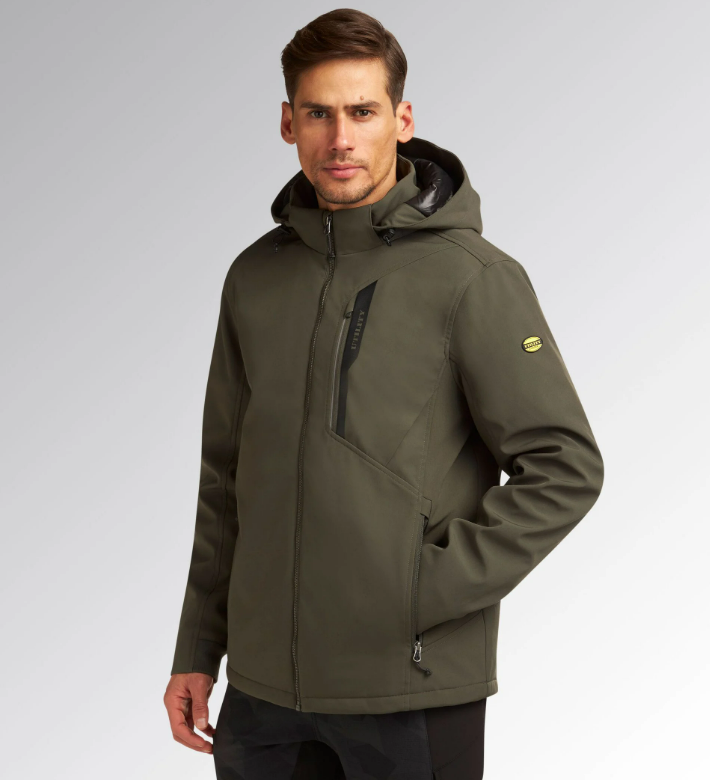 Giacca in softshell con imbottitura leggera, antivento e trattamento idrorepellente.