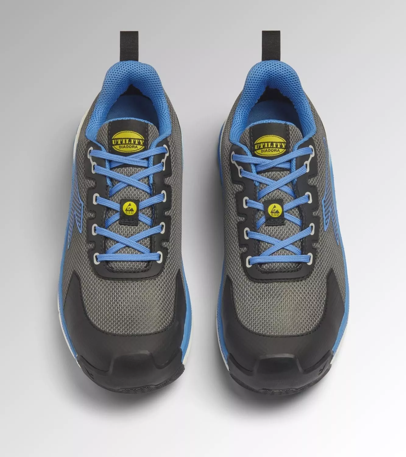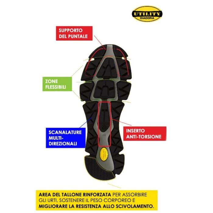 Scarpe Antinfortunistiche Basse Vortex DA2 Low firmate Diadora Utility, dotate di Tomaia in tessuto traspirante in Poliestere, Puntale in Alluminio con protezione fino a 200 J, Inserto antiperforazione K-SOLE, flessibile e ultra resistente, Suola con tecnologia Double Action, in EVA a doppia densità, per un perfetto assorbimento degli urti, rinforzi in poliuretano 3D Printing su punta e tallone per maggiore durabilità, Fodera in mesh 3D alveolare con inserto anti-scalzamento in microfibra, soletta microforata e removibile in schiuma PU a cellule aperte, traspirante con carboni attivi, Suola in gomma nitrilica resistente al calore da contatto e agli agenti esterni. Normative: S1PS, SR, HRO, ESD.
